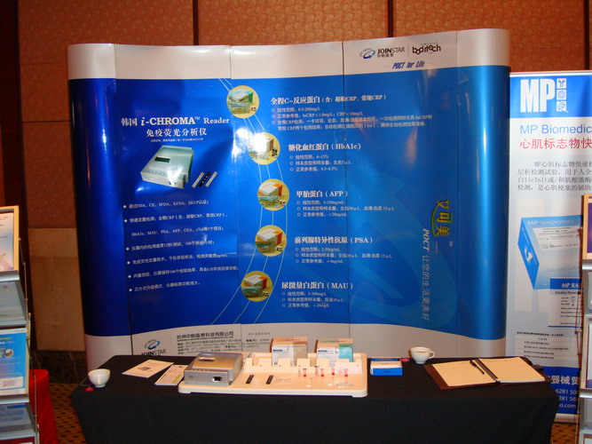 我公司在本次会议上重点展出了韩国Boditech公司的i-CHROMA(中文名:艾可美)免疫荧光分析系统和美国MP公司的心肌项目。