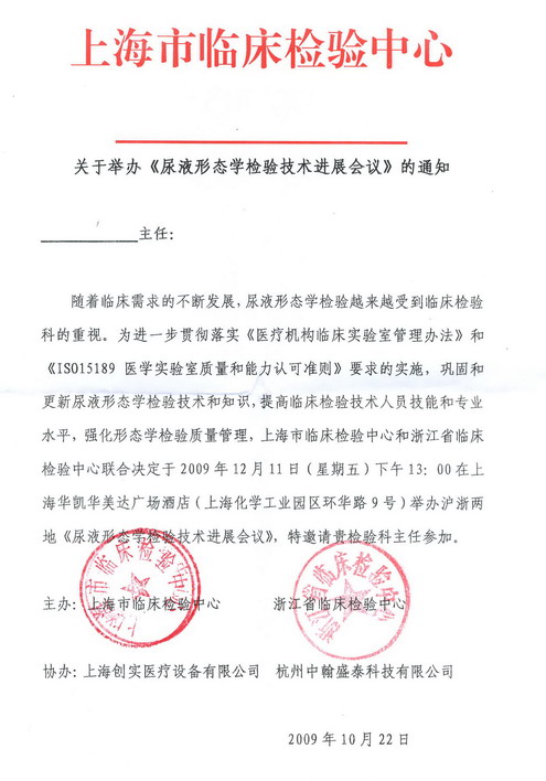 由上海市临床检验中心和浙江省临床检验中心联合举办的《尿液形态学检验技术进展会议》将于2009年12月11日下午3:00在上海华凯华美达广场酒店举行。本次会议将着重于巩固和更新尿液形态学检验技术和知识,提高临床检验技术人员技能和专业水平,强化形态学检验质量管理。欢迎您的光临!