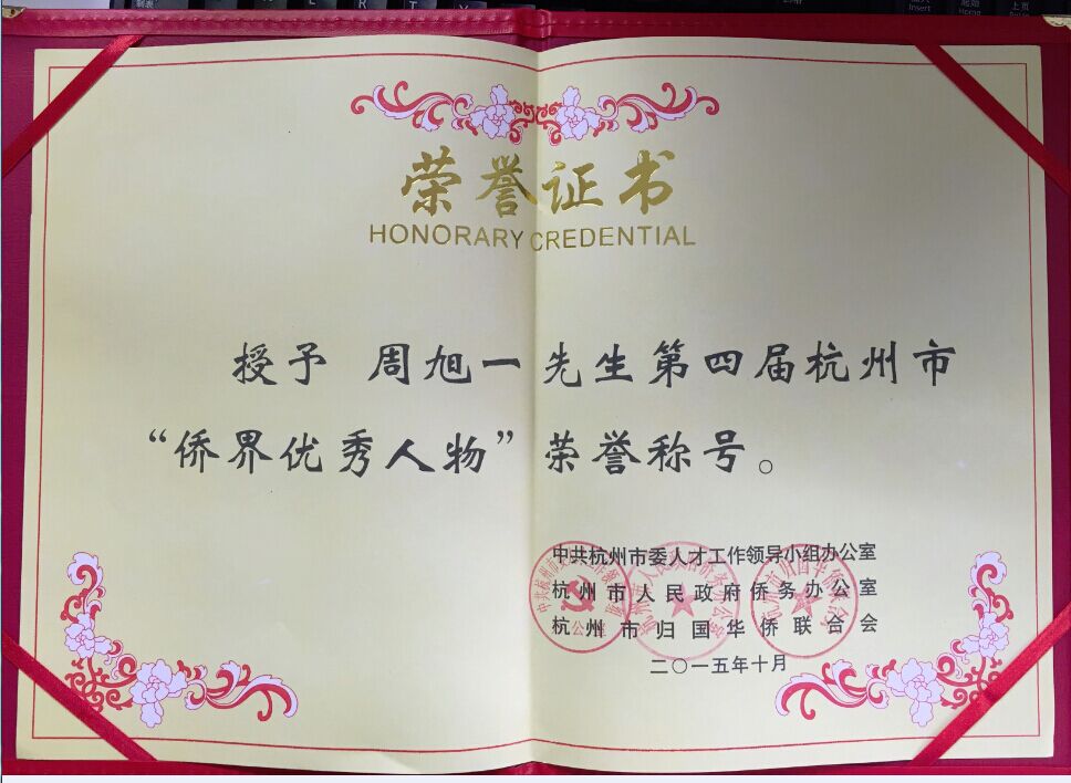 公司董事长周旭一先生荣获第四届杭州市“侨界优秀人物”荣誉称号。